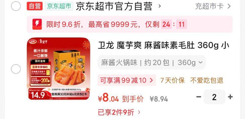 🚦 卫龙魔芋爽麻酱味素毛肚360g